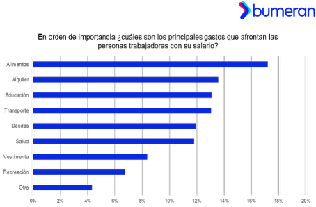 Entre los principales gastos que afrontan las personas trabajadoras con su salario, en orden de importancia, están: alimentación como el gasto principal (17%), vivienda (14%), educación (13%),  transporte (13%), deudas (12%) , salud (12%), vestimenta (8%), recreación (7%) y otros gastos (4%) en la última posición.