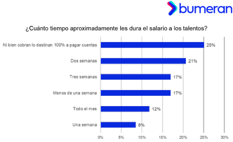 ¿Y cuánto tiempo aproximadamente les dura el salario a los talentos? El 25% de los talentos señala que tan pronto como cobran, destinan el 100% de su salario para pagar cuentas; el 21% indica que le dura dos semanas; el 17% señala que le dura tres semanas; y otro 17% que le dura menos de una semana. En tanto un 12% menciona que el salario le dura todo el mes, mientras que un 8% afirma que le dura una semana.