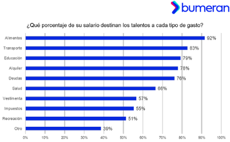 La mayoría de los talentos prioriza gastos esenciales en su presupuesto. En este sentido, los talentos indican que en alimentación gastan un 92% de su salario; un 83% en transporte; un 79% en educación; un 78% en vivienda; y un 76% al pago de deudas. Además, afirman que gastan un 66% de su salario en salud; vestimenta un 57%; impuestos un 55%; recreación 51% y un 39% en otro tipo de gastos.
