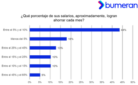 Entre quienes sí consiguen ahorrar, un 44% consigue guardar entre el 5% y el 10%; un 18% destina menos del 5% de su salario mensual al ahorro, un 13% logra ahorrar entre el 25% y el 45% de su ingreso mensual; un 10% ahorra entre el 15% y 25%; otro 10% entre el 10% y el 15%; y solo un 5% logra ahorrar entre el 45% y 65% de su salario. 8 de cada 10 peruanos considera insuficiente su salario para afrontar necesidades básicas.