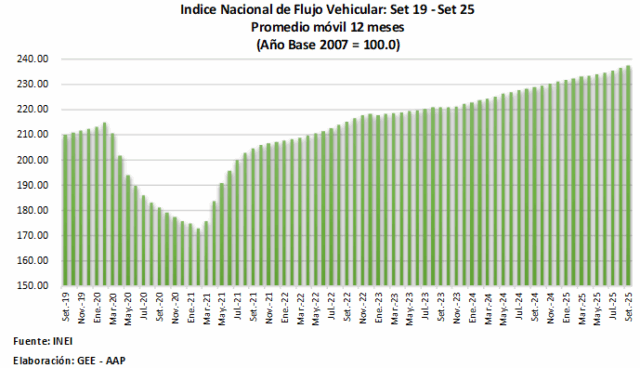 Según el reporte oficial, el Índice de Flujo Vehicular —que registra el tránsito de unidades livianas y pesadas a través de las garitas de peaje— creció 4,4% en comparación con septiembre del año anterior, impulsado por el aumento del tránsito de vehículos livianos (+3,2%) y pesados (+6,1%). La evolución del flujo vehicular confirma la recuperación y dinamismo del transporte en el país, tanto en la movilidad de personas como en el desplazamiento de mercancías”, sostuvo la AAP.