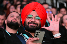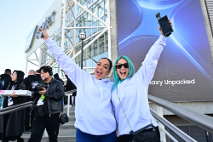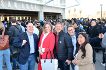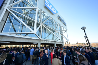 ▲ Entusiastas de Galaxy hacen FILA frente al SAP Center y el mural fotográfico del recinto a la espera de poder entrar