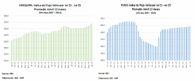 Al respecto, Morisaki, sostuvo que “para los próximos meses se espera que el índice de flujo vehicular mantenga su tendencia ascendente, en línea con el dinamismo que muestra la economía peruana, destacando el desempeño del consumo privado, que impulsa la circulación de vehículos livianos, y de la inversión privada, que sostiene el tránsito de vehículos pesados”. Flujo vehicular creció 4.1% en julio.