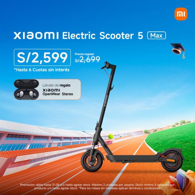 Llévate el Xiaomi Electric Scooter 5 Max a S/2,599. (precio regular: S/2,699) y de regalo recibirás unos Xiaomi Openwear Stereo.1
