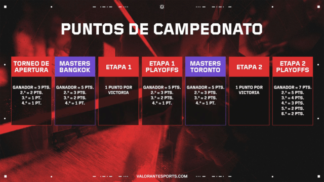 Se actualizaron los puntos de campeonato para garantizar que toda la temporada cuenta. Al igual que el año pasado, los equipos ganarán puntos en todas las etapas, pero esta vez hay más en juego. Otorgaremos más puntos en Masters y Playoffs, y todos los equipos podrán comenzar de cero a mitad de la temporada haciendo que todas las etapas sean importantes.