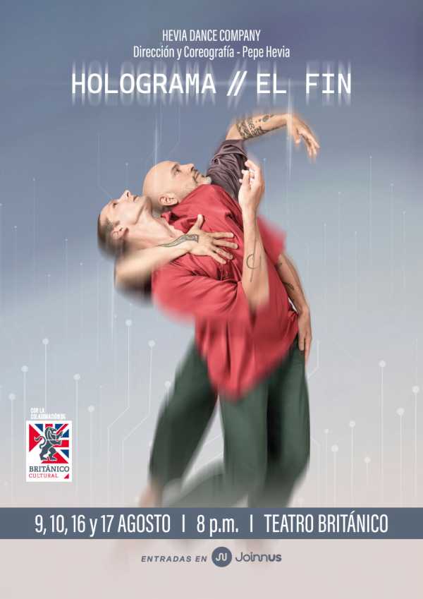 HOLOGRAMA / EL FIN, la más reciente obra del coreógrafo y director Pepe Hevia interpretada por la Hevia Dance Company, se estrena el sábado 9 de agosto en el Teatro Británico, en una breve temporada que va en funciones de 8 pm. hasta el 17 agosto. Con la esencia sugestiva, simbólica y poética que caracteriza a la compañía, esta nueva creación de danza contemporánea, explora la transformación del ser humano en la era digital, donde la existencia se deconstruye entre lo tecnológico y lo carnal. Pepe Hevia estrena su nueva creación Holagrama /El Fin en el teatro Británico.