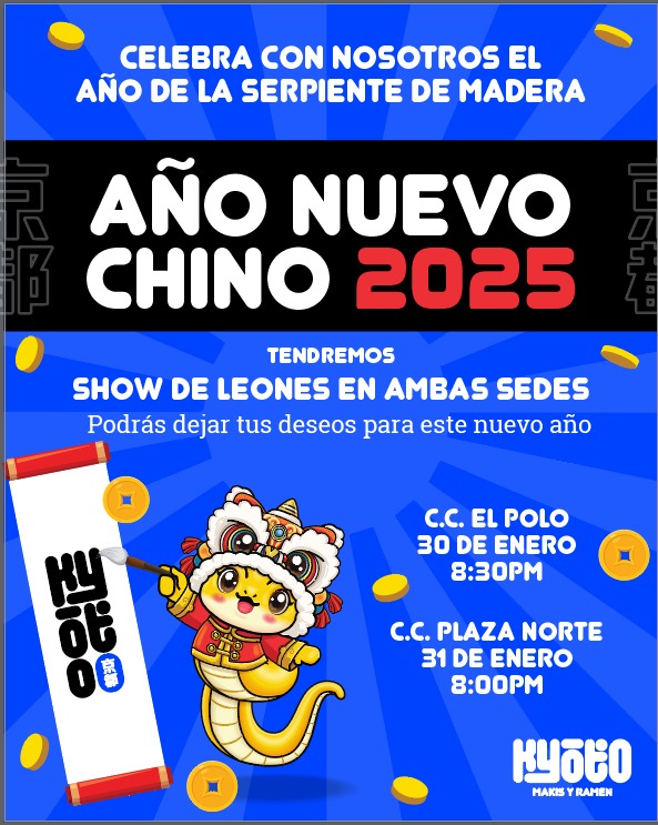 La celebración se llevará a cabo el jueves 30 de enero en CC. El Polo – Surco a las 8:30 pm, y viernes 31 en CC. Plaza Norte a las 8:00 pm. El reconocido restaurante presentará un show de leones en sus dos locales y los visitantes podrán dejar sus deseos en su árbol de sakura de Surco. Además, el día jueves 30 contarán con su promoción de “Sushi Day Kyoto”, la cual consiste en 2×1 en medios makis y el día viernes 31 con barra libre durante todo el día.