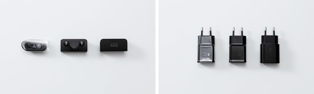 Los auriculares del Galaxy S9, S10 y S20 (izquierda) y los adaptadores de viaje (derecha), se muestran en orden de lanzamiento. Como puede ver, las películas de plástico ya no se utilizan para proteger estos productos en el empaque.
