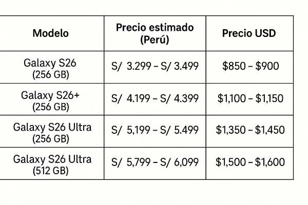 Precios estimados del Galaxy S26 en Perú