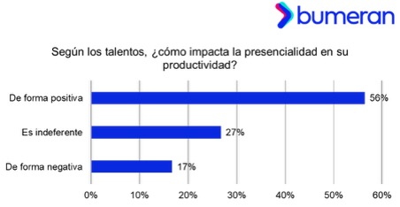 El 56% de los talentos dice que la presencialidad impacta positivamente en su productividad; el 27% menciona que es indiferente; y el 17% dice que el impacto es negativo.