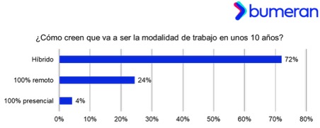 El 72% de los especialistas en HR cree que la modalidad de trabajo en 10 años será principalmente híbrida; el 24% cree que será 100% remota; y el 4% afirmó que será 100% presencial.