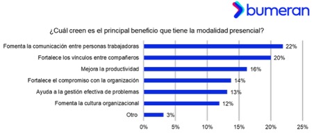 Entre los principales beneficios que tiene la modalidad presencial el 22% reconoce que fomenta la comunicación entre los integrantes de la organización; el 20% que fortalece los vínculos entre compañeros; el 16% que mejora la productividad; el 14% fortalece el compromiso con la organización; el 13% ayuda a la gestión efectiva de problemas; el 12% que fomenta la cultura organizacional; y el 3% menciona otras razones.