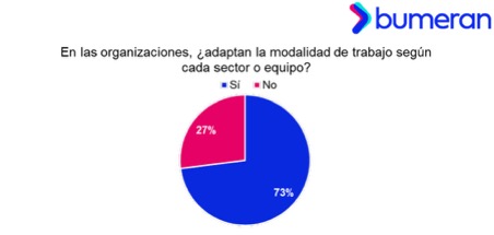 En las organizaciones, ¿adaptan la modalidad de trabajo según cada sector o equipo? El 73% de los especialistas afirma que las modalidades de trabajo se adaptan a los distintos equipos, mientras que el 27% dice que no lo hacen.
