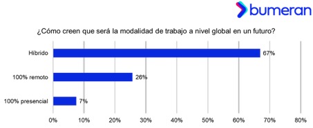 ¿Cómo creen que será la modalidad de trabajo a nivel global en un futuro? El 67% de los talentos cree que la modalidad de trabajo será híbrida; el 26% totalmente remota; y el 7% totalmente presencial.