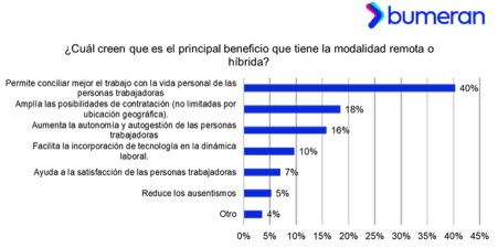 Por otro lado, entre los beneficios que tiene la modalidad remota o híbrida, el 40% de los especialistas reconocen como principal beneficio que permite conciliar mejor el trabajo con la vida personal; el 18% dice que amplía las posibilidades de contratación; el 16% que aumenta la autonomía y autogestión de las personas trabajadoras; el 10% que facilita la incorporación de tecnología en la dinámica laboral; el 7% que ayuda a la satisfacción de las personas trabajadoras; el 5% que reduce los ausentismos; y el 4% menciona otras razones.