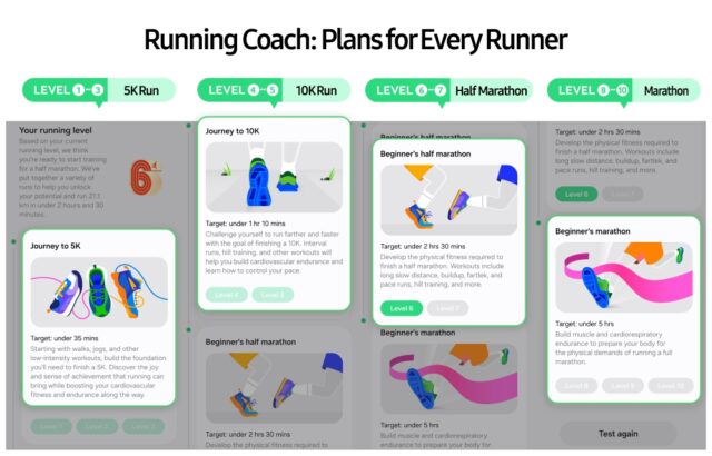 El primer paso es la prueba de nivel de running. Antes de comenzar el entrenamiento, Running Coach evalúa la capacidad del corredor, lo asigna a uno de 10 niveles y recomienda un programa adaptado de tres a cinco semanas.
