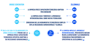 En cuanto a las oportunidades de desarrollo profesional, el estudio resalta que 8 de cada 10 colaboradores de la Bridge Generation valoran la diversidad y la mentoría intergeneracional como impulsores para su crecimiento profesional. En paralelo, 9 de cada 10 Zillennials consideran crucial el reskilling y la formación continua como factores esenciales para su desarrollo. La importancia que ambas generaciones le otorgan a la formación y el aprendizaje continuo abre una puerta de oportunidad para las empresas, que pueden centrarse en fomentar programas de capacitación y mentoring que crucen las barreras generacionales y respondan a las necesidades de ambos grupos.