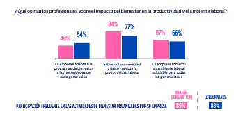 El 84% de la Bridge Generation y 77% de los Zillennials reconocen que el bienestar impacta directamente en su productividad laboral. Sin embargo, a pesar de reconocer su importancia, solo 6 de cada 10 colaboradores de ambas generaciones perciben que los programas de bienestar implementados por sus empresas están diseñados de manera efectiva para satisfacer sus expectativas. A pesar de esta insatisfacción, la participación en estos programas es alta, con 89% de la Bridge Generation y 88% de los Zillennials mostrando un compromiso activo con estas iniciativas, lo que refleja un alto nivel de apertura y disposición para mejorar su bienestar.