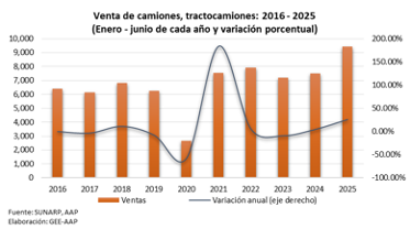 En el segmento de vehículos pesados, la venta de camiones y tractocamiones nuevos alcanzó las 1,675 unidades en junio (+45.8 %, en comparación con igual mes de 2024). En el primer semestre, se comercializaron 9,443 unidades, lo que representa un aumento de 25.7 % en comparación con el mismo periodo del 2024.